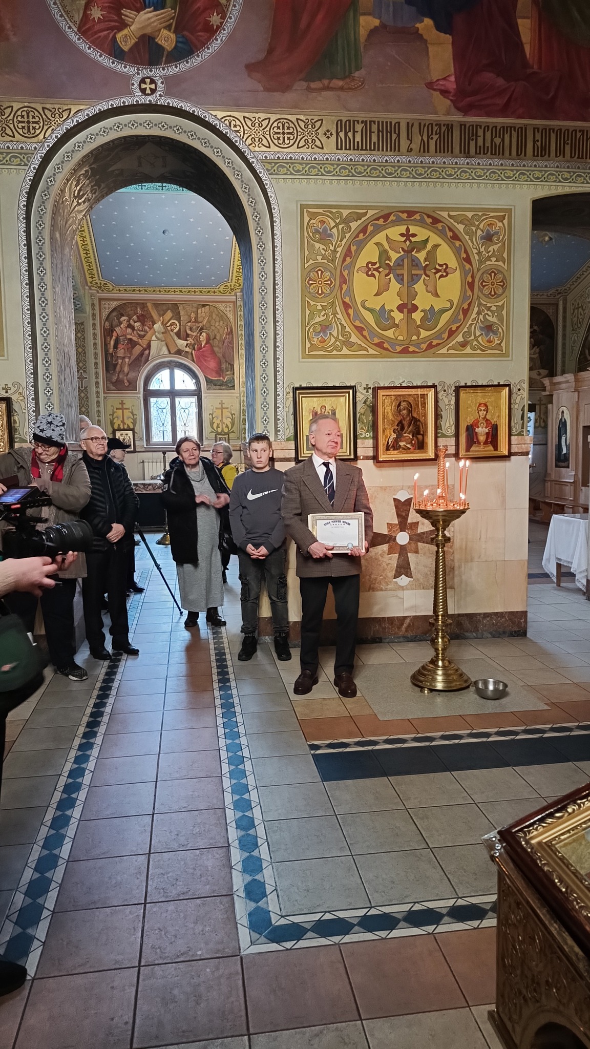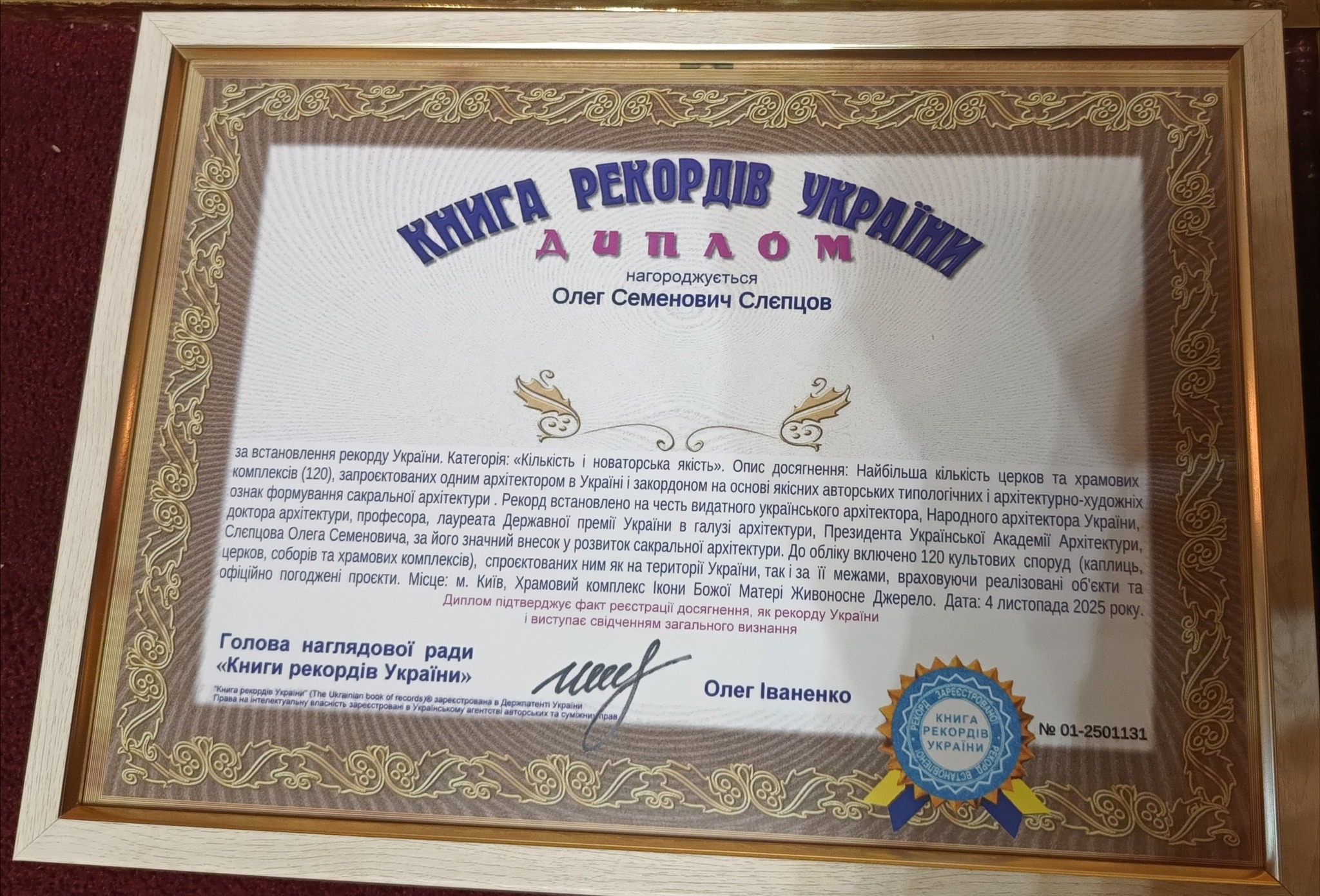 церемонія нагородження Олега Семеновича Слєпцова фундацією ”Книга рекордів України” за встановлення рекорду України у категорії ”Кількість і новаторська якість”. Олег Семенович є не лише автором проєкту відбудови нашої церкви, але завдяки його зусиллям і творчому внеску споруджено 120 храмових комплексів, церков і каплиць в Україні та закордоном. Духівництво нашого храму та запрошені священнослужителі звершили подячний молебень за будівничого і його співробітників. По завершенні богослужіння відбулася церемонія відзнаки Олега Семеновича Слєпцова – архітектора, педагога, художника, майстер декоративного мистецтва, композитора, співака, доктора архітектури, професора, президента Української академії архітектури, члена-кореспондента Міжнародної академії архітектури, народного архітектора України, члена Національної спілки архітекторів України та Національної спілки художників України, директора науково-проєктного архітектурного бюро «ЛІЦЕНЗіАРХ», завідувача кафедри основ архітектури та архітектурного проєктування Київського національного університету будівництва і архітектури.