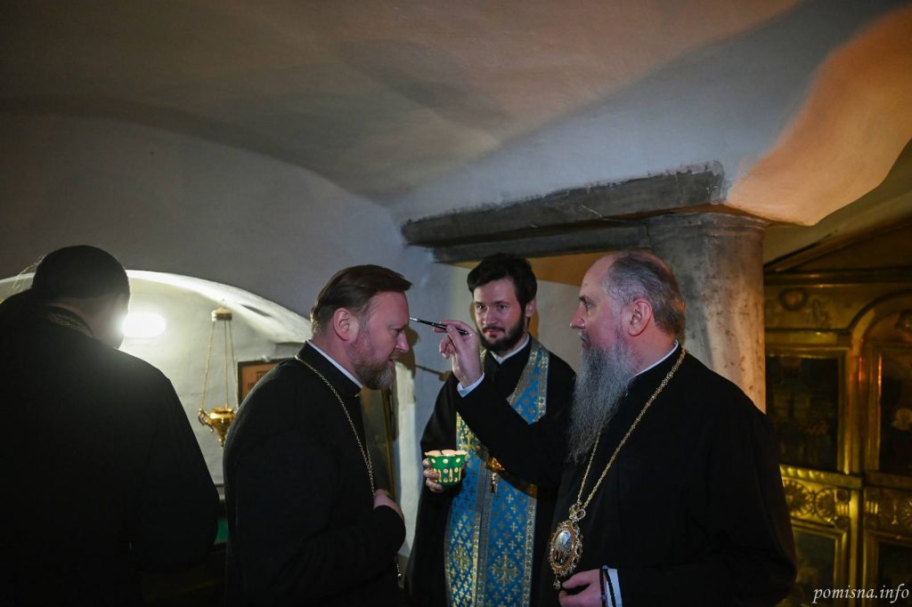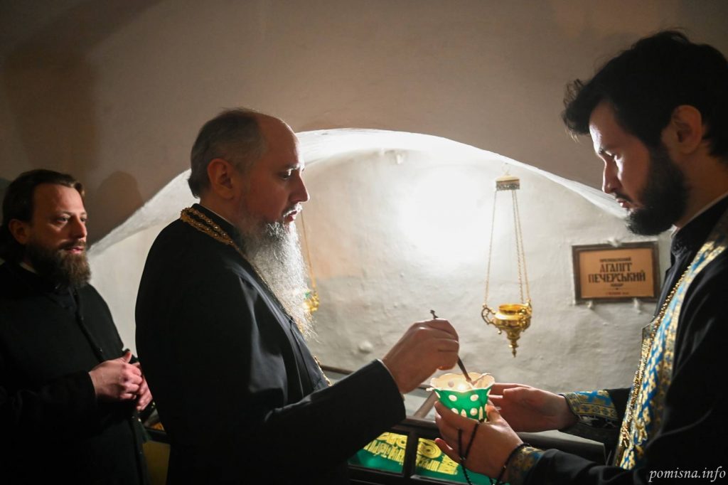 По завершенню відправи Предстоятель Православної Церкви України звернувся до присутніх зі словом, вклонився у печерах перед святими мощами преподобних отців Печерських та помазав присутніх освяченим єлеєм.