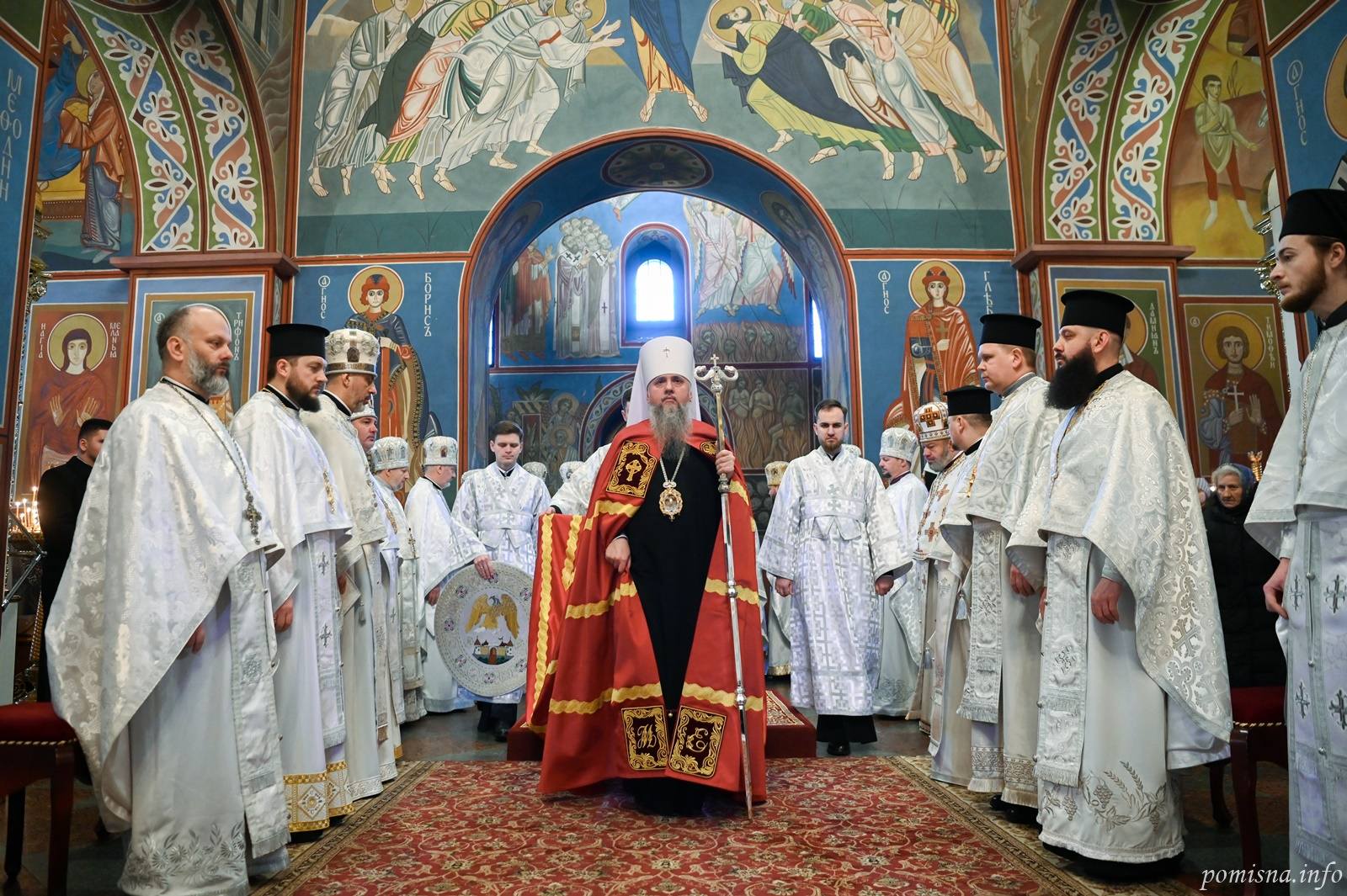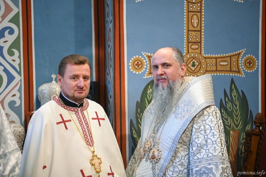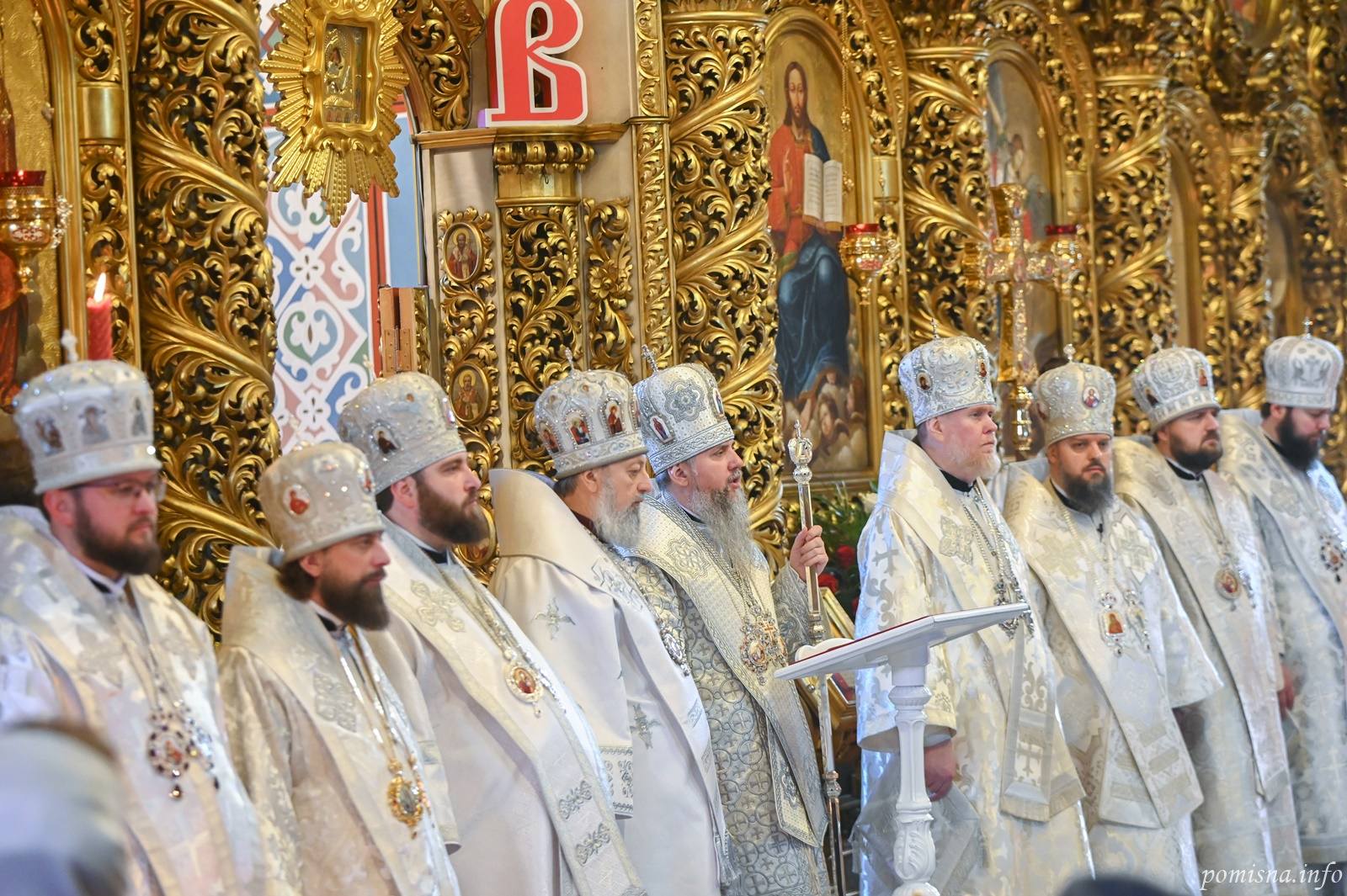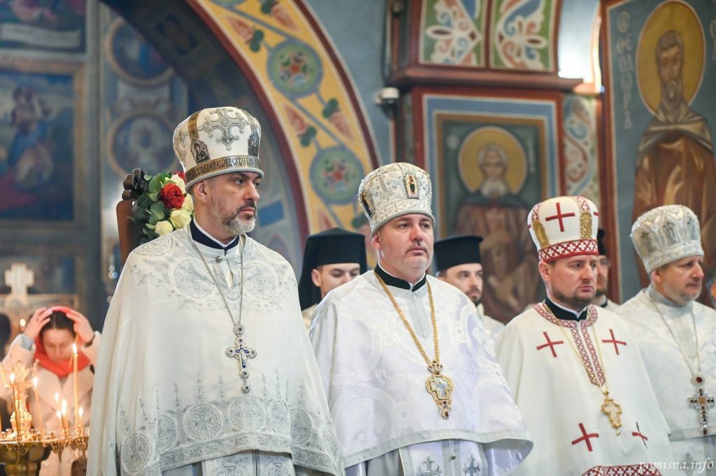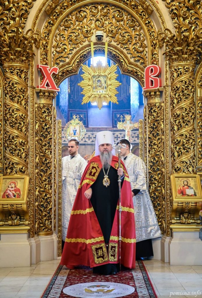 Предстоятелю автокефальної Української Православної Церкви співслужили митрополит Білоцерківський Євстратій, архієпископ Луганський і Старобільський Лаврентій, намісник Золотоверхої обителі архієпископ Вишгородський Агапіт, єпископ Васильківський Єфрем, єпископ Богуславський Арсеній, єпископ Бориспільський Авраамій, єпископ Ірпінський Феодосій, єпископ Макарівський Рафаїл, всечесна братія монастиря та численне духовенство. У богослужінні взяв участь благочинний Святошинського і Голосіївського районів міста Києва, настоятель храму на честь ікони Божої Матері ”Живоносне Джерело” протоієрей Роман Музика.
